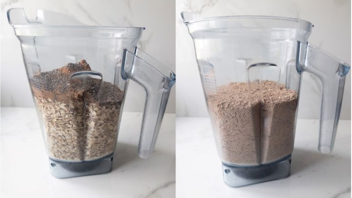 - Add the oats, cocoa powder, and chia seeds to a blender and blend until finely ground. Not feeling chocolate? Omit the cocoa powder and check out the Variations section!