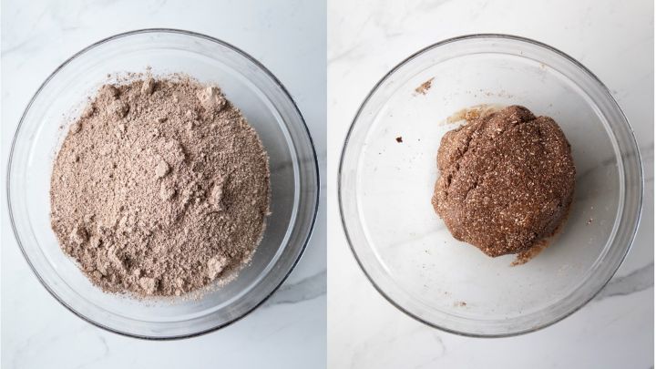 - Pour the blended oat mixture into the bowl with the liquid ingredients and mix until fully incorporated. It may seem like it won't come together at first, but keep working it. Using your hands to knead it like dough toward the end really helps.