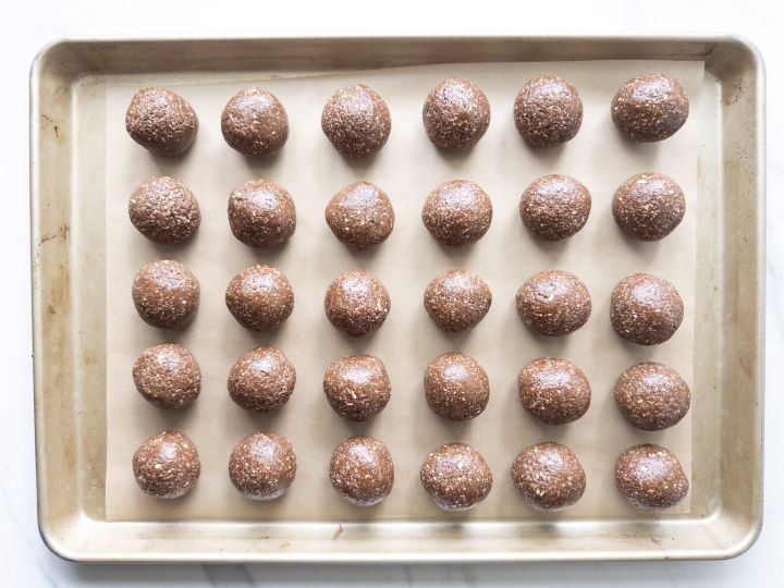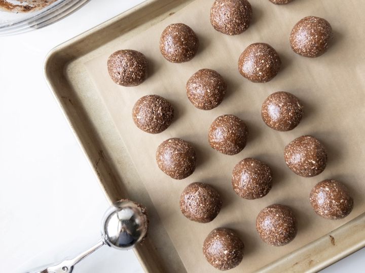 - Line a baking sheet with parchment paper. Using a 1½-tablespoon cookie scoop, portion the mixture and roll each scoop into a ball. Repeat until all the mixture is used.